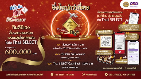 นอกจากนี้ ยังมอบโชคใหญ่สำหรับสายกิน สายเที่ยว ที่มารับประทานอาหาร ณ ร้านอาหารที่ได้รับตราสัญลักษณ์ Thai SELECT ทั่วประเทศ กับกิจกรรม ‘กินดีมีเฮง’ ลิ้มรสความอร่อยพร้อมลุ้นโชคสุดฟินคูณสาม รวมมูลค่ากว่า 600,000 บาท ได้แก่ ฟินที่ 1 ลุ้นทองคำหนัก 1 บาท ซึ่งเป็นรุ่นพิเศษ Thai SELECT Limited Edition ฟินที่ 2 ทริปท่องเที่ยวสุดเอ็กซ์คลูซีฟตามรอยร้าน Thai SELECT และ ฟินที่ 3 Thai SELECT Cash Back รับสิทธิ์ลุ้น Cash Back รวมมูลค่ากว่า 140,000 บาท เพียงรับประทานอาหารที่ร้าน Thai SELECT ครบ 500 บาทขึ้นไป และส่งภาพใบเสร็จ พร้อมกรอกรายละเอียดตามแบบฟอร์มที่ LINE Official Account: @thaiselect โดยใบเสร็จ 1 ใบ ลุ้นโชคได้ 1 สิทธิ์ สามารถส่งใบเสร็จร่วมกิจกรรมได้ไม่จำกัดจำนวนครั้ง ตั้งแต่วันนี้ ไปจนถึงวันที่ 15 ตุลาคม 2568