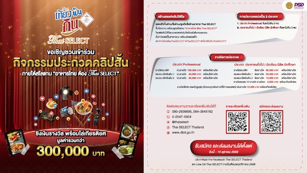 และอีกหนึ่งกิจกรรม เอาใจสายครีเอเตอร์กับ “กิจกรรมประกวดคลิปวิดีโอสั้น” ภายใต้สโลแกน ‘อาหารไทย ต้อง Thai SELECT’ ชิงเงินรางวัลและโล่เกียรติยศ มูลค่ารวมกว่า 300,000 บาท โดยแบ่งรางวัลการประกวดแบ่งออกเป็น 2 ประเภท ได้แก่ 1) ประเภท Professional ทีมละไม่เกิน 3 คน จำนวน 3 รางวัล โดยมีรางวัลชนะเลิศมูลค่า 100,000 บาท รางวัลที่ 2 มูลค่า 40,000 บาท และรางวัลที่ 3 มูลค่า 25,000 บาท และ 2) ประเภทประชาชนทั่วไป นักเรียน นิสิต นักศึกษา ทีมละไม่เกิน 3 คน จำนวน 13 รางวัล รางวัลชนะเลิศมูลค่า 60,000 บาท รางวัลที่ 2 มูลค่า 25,000 บาท รางวัลที่ 3 มูลค่า 15,000 บาท และรางวัลชมเชย 10 รางวัล รางวัลละ 2,500 บาท นอกจากนี้ ยังมีรางวัลพิเศษสำหรับคลิปที่มียอดวิวสูงสุดจากทุกแพลตฟอร์มมูลค่า 10,000 บาท พร้อมเกียรติบัตรจำนวน 1 รางวัล ผู้สนใจสามารถสมัครและส่งผลงานผ่านทาง https://thaiselect.my.canva.site/ ได้ตั้งแต่วันนี้ไปจนถึงวันที่ 15 ตุลาคม 2568 ติดตามรายละเอียดเพิ่มเติมได้ที่ Facebook: Thai SELECT Thailand และ LINE Official Account: @thaiselect